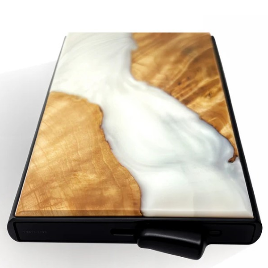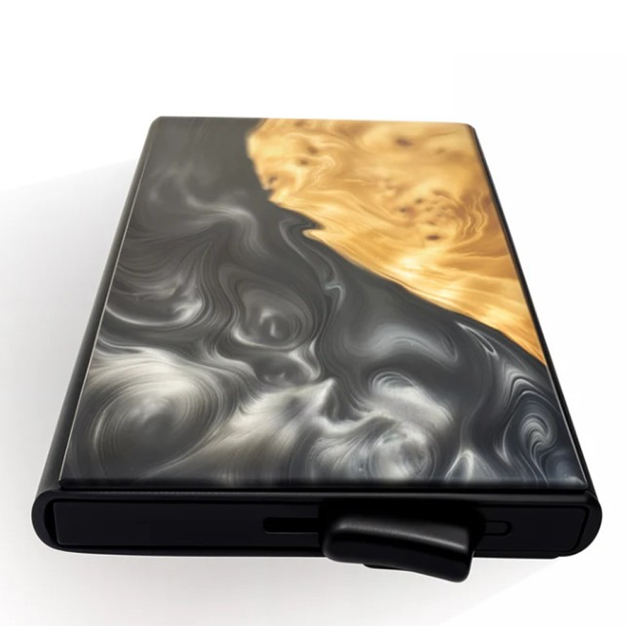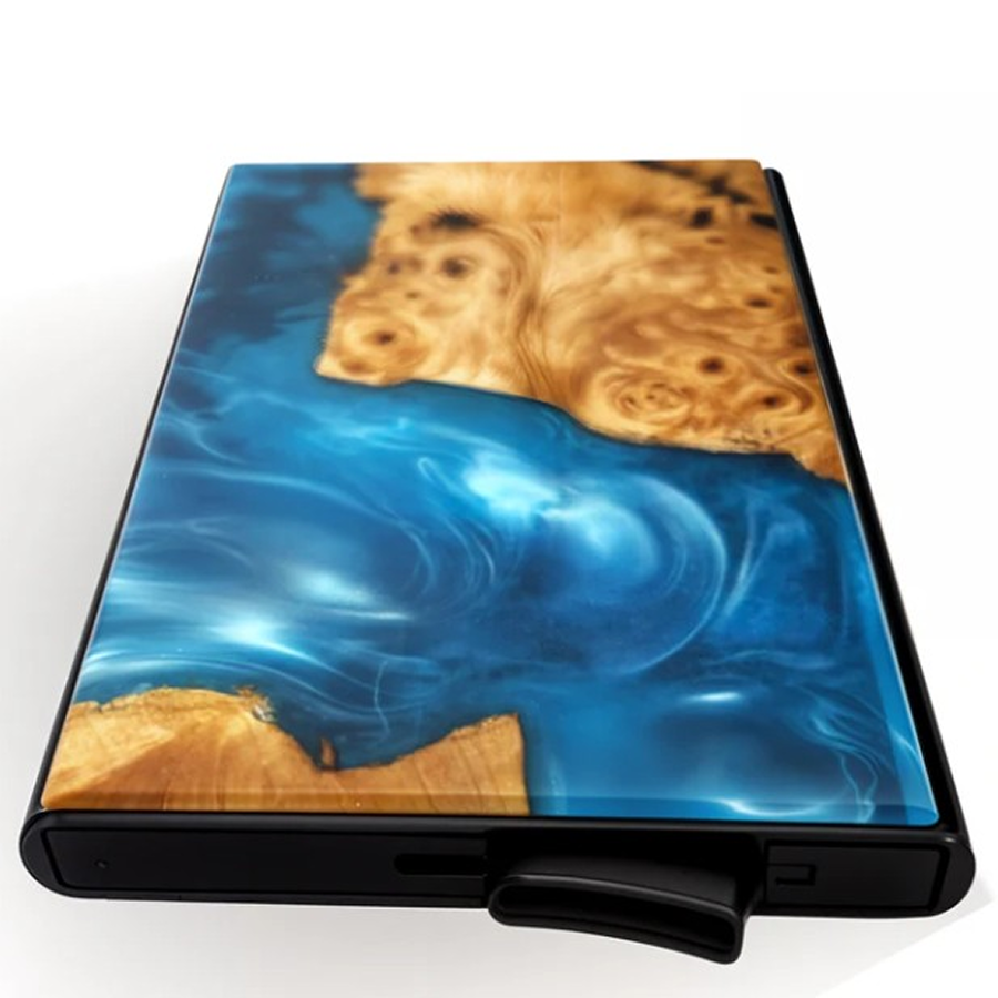 - Metal alloy wallet with maple/birch wood burl and vibrant resin